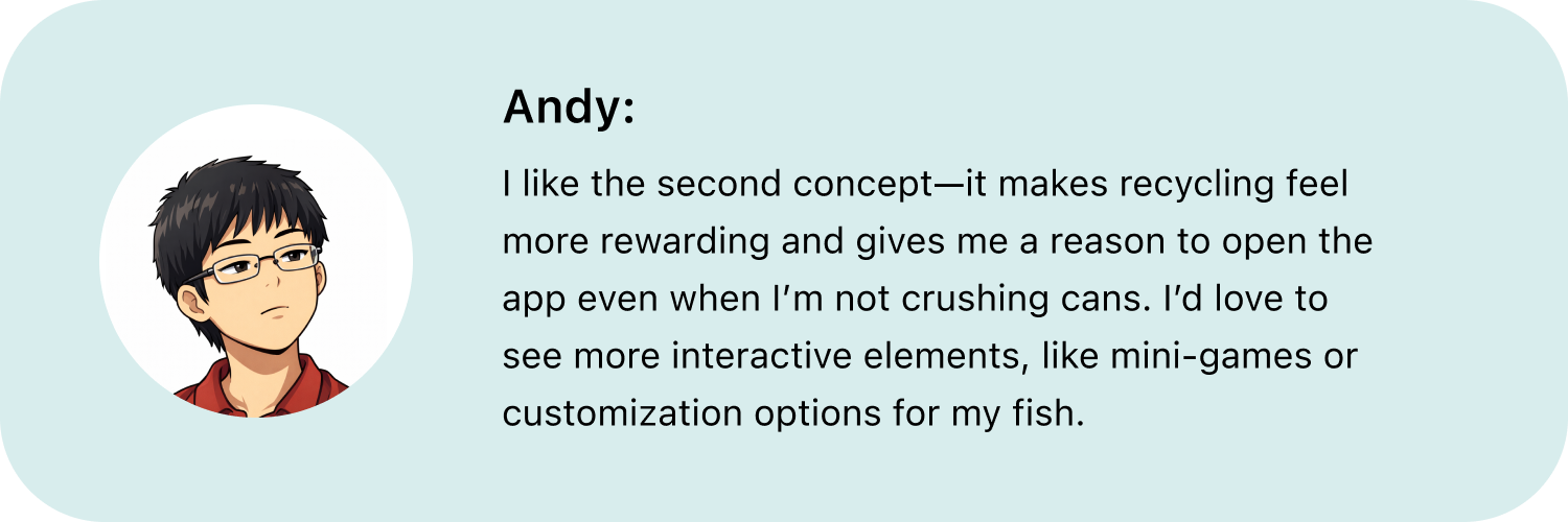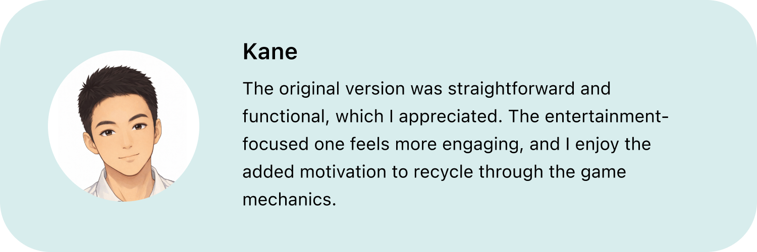 We realized that for the app to have a meaningful real-world impact, collaboration with local environmental government support is essential. Their involvement in promoting recycling initiatives and integrating real-life incentives could enhance user participation and drive long-term behavioral change.